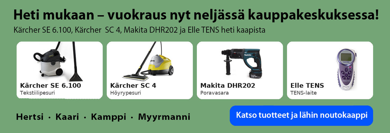 "Helppo vuokraus, onnistui nopeasti myös sunnuntaina. Kätevä ja hyödyllinen tuote. Plussaa edullisesta hinnasta. Hyvä 2 viikon vuokrausaika. Suosittelen! "
